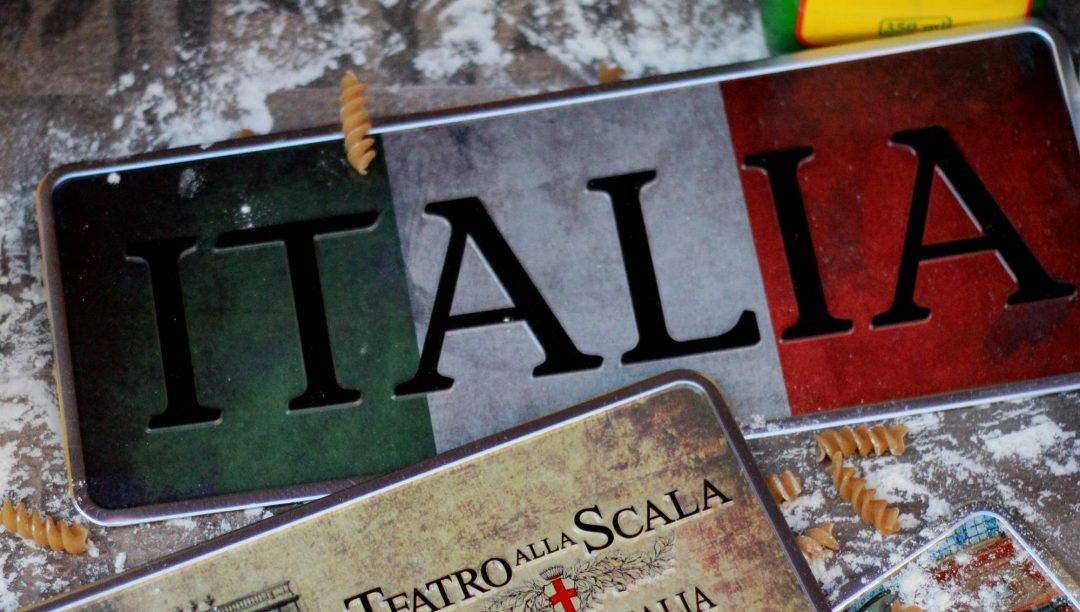 Metal plate, in relief, with a vintage illustration of the National Flag of Italy. In this plate, the name ‘Italia’, appears in high relief and in black.